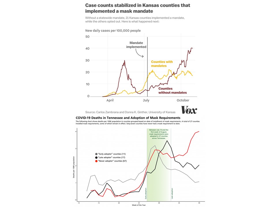 The upper graph in Fig. II.1 compares COVID cases per 100,000 people in Kansas counties that implemented a mask mandate vs. counties that opted out. COVID cases stabilized in counties with mask mandates but rose rapidly in counties with no mandates. The lower curve in Fig. II.1 compares relative per capita COVID-19 deaths in Tennessee counties against the choice to adopt mask mandates. The grey curves show death rates in “early adopter” counties; black curves are for “late adopter” counties; and red curves for counties that never adopted a mandate. The graph clearly shows that adoption of mask mandates decreased COVID fatalities.