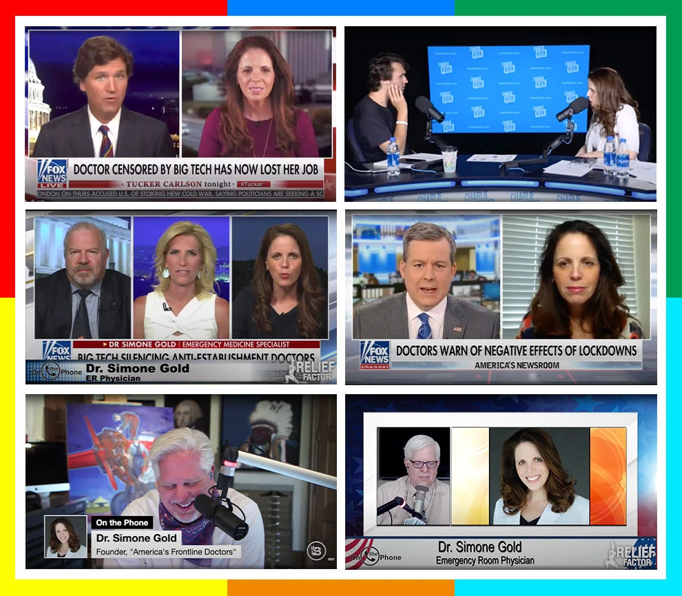 Following her appearance at the “America’s Frontline Doctors” event in July, 2020, Gold became a favorite of right-wing commentators, particularly on Fox News network. She appeared with right-wing luminaries such as Sebastian Gorka, Glenn Beck, Charlie Kirk (founder of the organization Turning Point USA), Laura Ingraham and Tucker Carlson. Early on, her main message was her advocacy for hydroxychloroquine (HCQ), and her claim that she had been made part of the “medical cancel culture” when she was told not to treat COVID patients with HCQ, because at that time the anti-malaria drug had not been authorized by the FDA for use against COVID. The drug HCQ would later receive emergency-use authorization from the FDA for treatment of COVID, but the authorization was revoked after it was found in large-sample clinical studies that HCQ was useless against the coronavirus, and that it also had some serious side effects. Gold stated that she had been fired from the hospitals where she had worked as an emergency room physician, as a result of the misinformation she had spread about the pandemic.