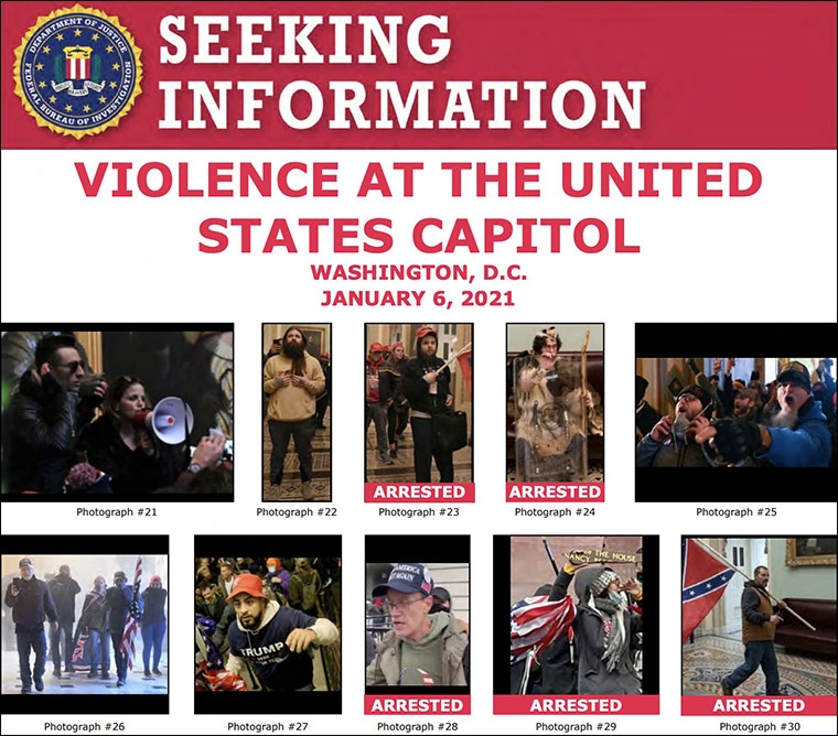 Several photos and videos were taken of Gold and Strand inside the Capitol. After the insurrection, the FBI rapidly issued posters seeking information about people seen inside the Capitol on Jan. 6. In the poster in Fig. II.5, you can see Gold and Strand in the composite FBI poster at top left. On Jan. 18, 2021, FBI agents entered the house of Simone Gold and arrested her and John Strand (Strand is currently living with Gold). Dr. Gold was charged with entering a restricted building or grounds, disorderly conduct, and violent entry. She was arraigned on Feb. 5, where she pleaded not guilty to all charges. Gold has said “I do regret being there,” but at the same time she claimed that “Where I was, was incredibly peaceful.” This statement contradicts videos that show Gold alongside people breaking windows at the Capitol and scuffling with Capitol police.