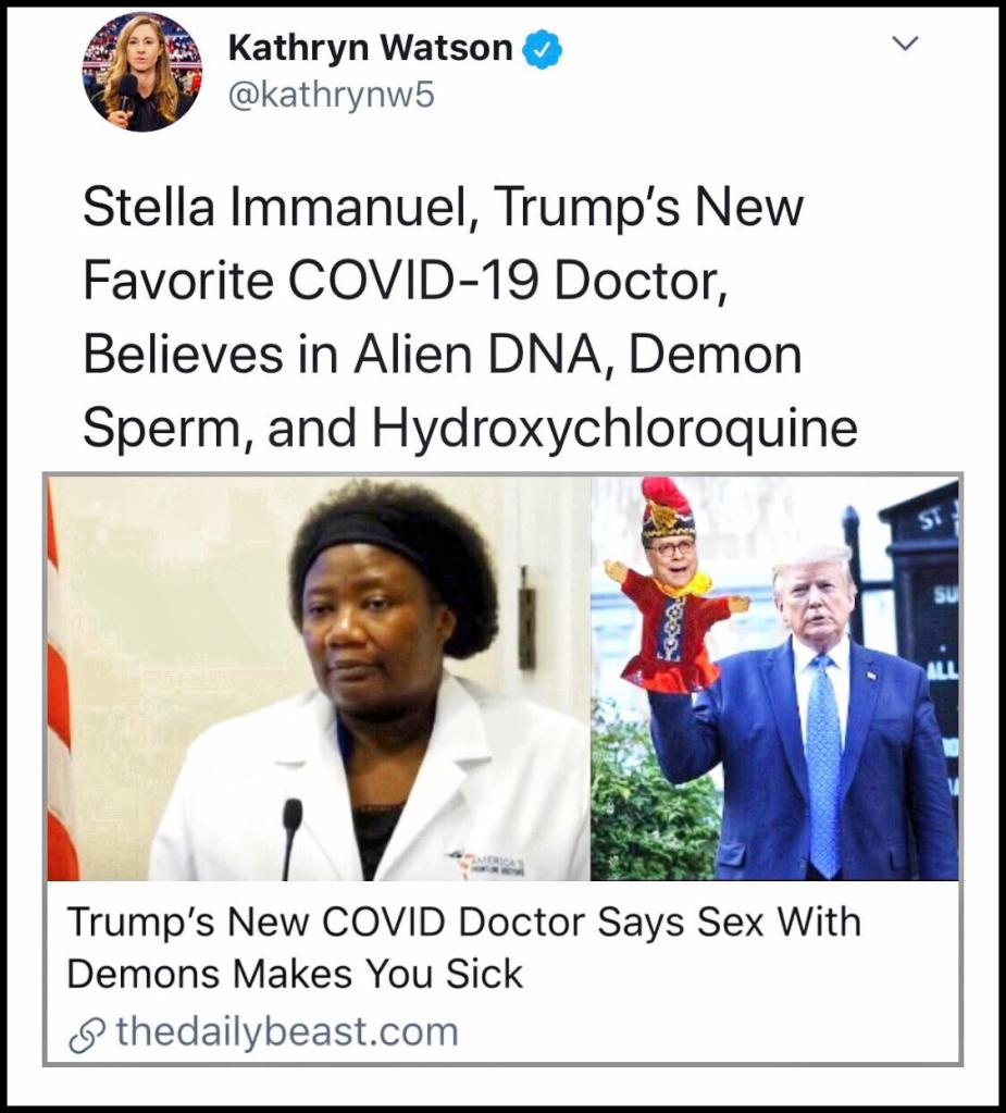 The video of the AFLDS press conference went viral (although it was removed the following day from Facebook, Twitter and YouTube), with a strong boost from Trump himself, who referred to them, and specifically to “star witness” Stella Immanuel, as “very respected doctors.” Stella Immanuel will also be profiled in section II of this post, but is by now best known for her insistence that many medical conditions are caused by “demon sperm” transmitted during sexual relations people have in their dreams with witches and demons. She and the other AFLDS members were chosen for their strong support of Trump’s own pet theories, and hardly for their esteem within the medical science community or for views supported by clinical research. Nor did they have any particular expertise in treating COVID, despite their claims to the contrary. As noted by MedPage Today on July 29, 2020, “none of the most vocal members [of AFLDS] have practices that would place them on the actual front lines of the COVID-19 pandemic. Some don’t currently practice at all. Two of those appearing at the Monday event are ophthalmologists, one of whom is no longer licensed.”