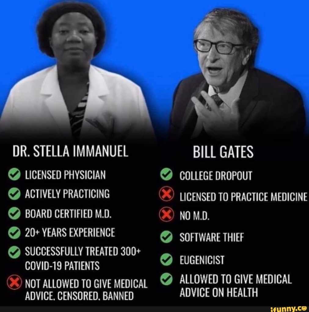 There is also a Facebook post that compares expertise and motive between Dr. Stella Immanuel and Bill Gates. This is shown in Fig. II.8. It lists Immanuel’s credentials as “Licensed Physician” and “Board-Certified M.D.,” while Bill Gates is listed as “College Dropout” and “No M.D.” The post further claims that while Immanuel is “Censored and Banned,” the “Eugenicist” Bill Gates is “Allowed to Give Medical Advice on Health.” Of course, the Facebook post makes no mention of Dr. Immanuel’s unhinged claims about demon sperm, that reptilians and aliens are running the U.S. government, or that scientists are developing a vaccine to prevent people from being religious.
