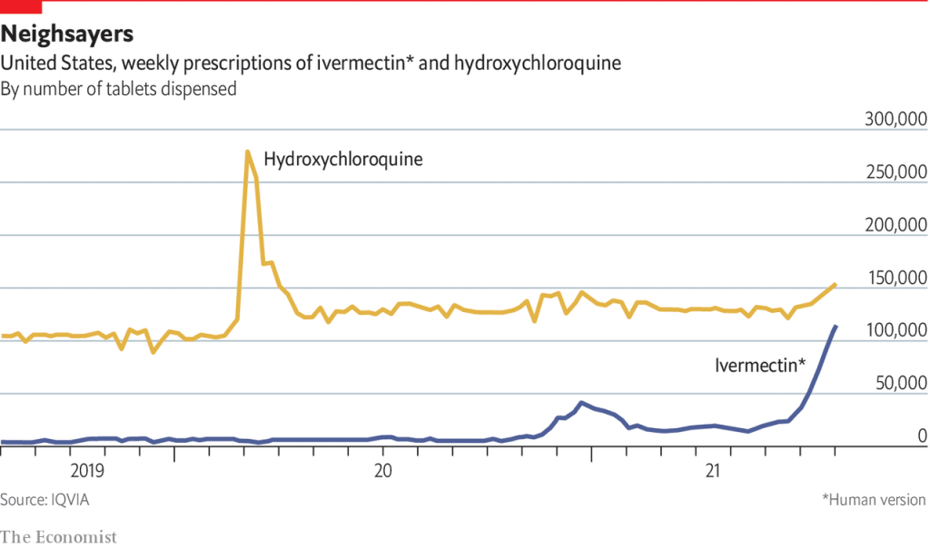 Vaccine misinformation is a central part of the AFLDS business model, allowing them to rake in money by prescribing unapproved and ineffective drugs. Ivermectin is a drug approved by the FDA for use to treat or prevent parasites in animals or, at very specific doses, to treat humans for parasitic worms, head lice and some skin conditions. Like HCQ it attracted rapidly growing attention (see Fig. I.4) among desperate COVID sufferers on the basis of some early anecdotal evidence of success. Many of the early clinical studies reporting ivermectin results were poorly controlled, statistically biased or flawed in other ways. The most dramatic result reported a reduction in COVID death rates by 90% from ivermectin treatment, but the paper was soon withdrawn because of “ethical concerns.” Specifically, other researchers found multiple causes for concern “including dozens of patient records that seemed to be duplicates, inconsistencies between the raw data and the information in the paper, patients whose records indicate they died before the study’s start date, and numbers that seemed to be too consistent to have occurred by chance.” The FDA states that “Currently available data do not show ivermectin is effective against COVID-19. Clinical trials assessing ivermectin tablets for the prevention or treatment of COVID-19 in people are ongoing. Taking large doses of ivermectin is dangerous.” More colloquially, the FDA addressed the many people taking ivermectin doses intended for animals in a tweet: “You are not a horse. You are not a cow. Seriously, y’all. Stop it.”