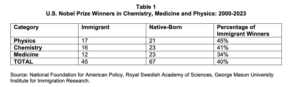 U.S. economic and geopolitical dominance since the end of World War II has been driven, in significant part, by its dominance in science and technology. One estimate is that 85% of the country’s post-war economic growth has been driven by advancements in science and technology. Those same advancements have improved our national security and transformed the daily lives of Americans. And that dominance has been critically supported by outstanding immigrant scientists. For example, during the 21st century 40% of Nobel Prizes in Physics, Chemistry, and Medicine awarded to American scientists have gone to first-generation immigrants, as summarized in Fig. I.1. That percentage is only slightly increased from the 36% of American awards given to immigrants over the full history of the Nobel Prize from 1901 through 2023. Furthermore, 43% of American workers with doctorates in science and engineering fields are currently foreign-born.