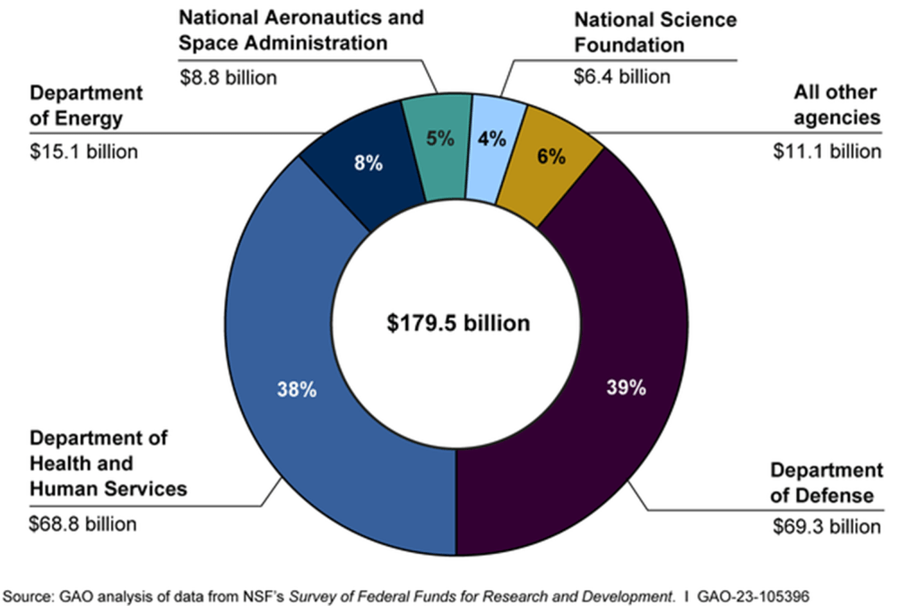 Figure III.6 shows the breakdown of federal R&D spending over various agencies. The total amount for fiscal 2021 was $179.5 billion. Of this amount, about 38% each was allotted to the Department of Health and Human Services and the Defense Department; the Department of Energy received $15.1 billion; NASA $8.8 billion, the NSF $6.4 billion; and all other agencies received $11.1 billion. This results in enormous returns for our economy. A 2023 study of the National Institutes of Health estimated that every dollar invested in NIH produces $2.56 in new economic activity. For example, NIH-sponsored research led to the discovery of the connection between cholesterol and heart disease. Subsequent studies have produced cholesterol-lowering medications that have produced a 67.6% decrease in heart disease deaths from 1969 to 2015. Clearly, investments in research and development create jobs and fuel the U.S. economy.