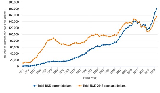 The final element that fueled the American resurgence in science and technology was the existence of federal funding. This was inspired by Vannevar Bush’s 1945 report Science: the Endless Frontier, which we reviewed in an earlier section. This called for substantial, sustained and reliable federal funding of research and technology. The non-defense federal funding for research and development is mainly distributed through a number of federal agencies. Figure III.5 shows the total federal R&D spending from 1951 to 2020. The blue dots are in at-year dollars, while the red dots represent the total R&D funding in constant 2012 dollars. Note that in 2020 the total federal R&D funding was $180 billion. The results of this federal support have made the U.S. medical research the top in the world. American research and technology have produced pharmaceutical and medical-products industries that are the best in their fields.