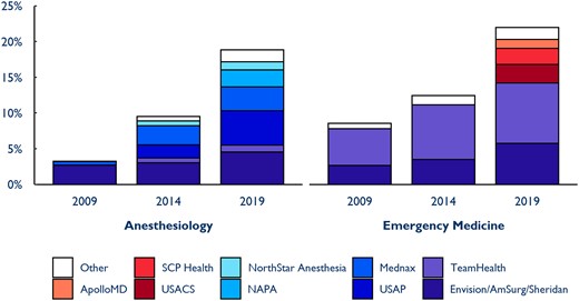 Figure III.7: The penetration of private equity into the fields of anesthesiology and emergency medicine. The figure shows eight firms owned by private equity and the percentage of all such firms from 2009 to 2019. In 2009, only 4% of anesthesiologists and 9% of ER doctors belonged to firms owned by private equity; by 2019 20% of anesthesiologists and 23% of ER doctors belonged to such firms.