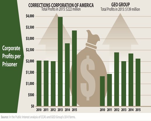 Figure IV.2: Profits per prisoner for two of the largest private prison companies, Corrections Corporation of America (CCA) and GEO Group, from 2010 to 2015. In 2015 CCA total profit was $222 million, while GEO profit was $139 million.