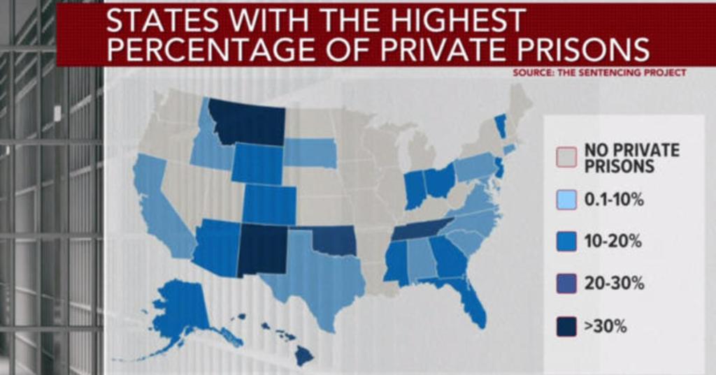 Figure IV.1: The percentage of private prisons in each state, from The Sentencing Project. States such as Montana, New Mexico, Oklahoma and Tennessee have the highest proportion of private prisons.