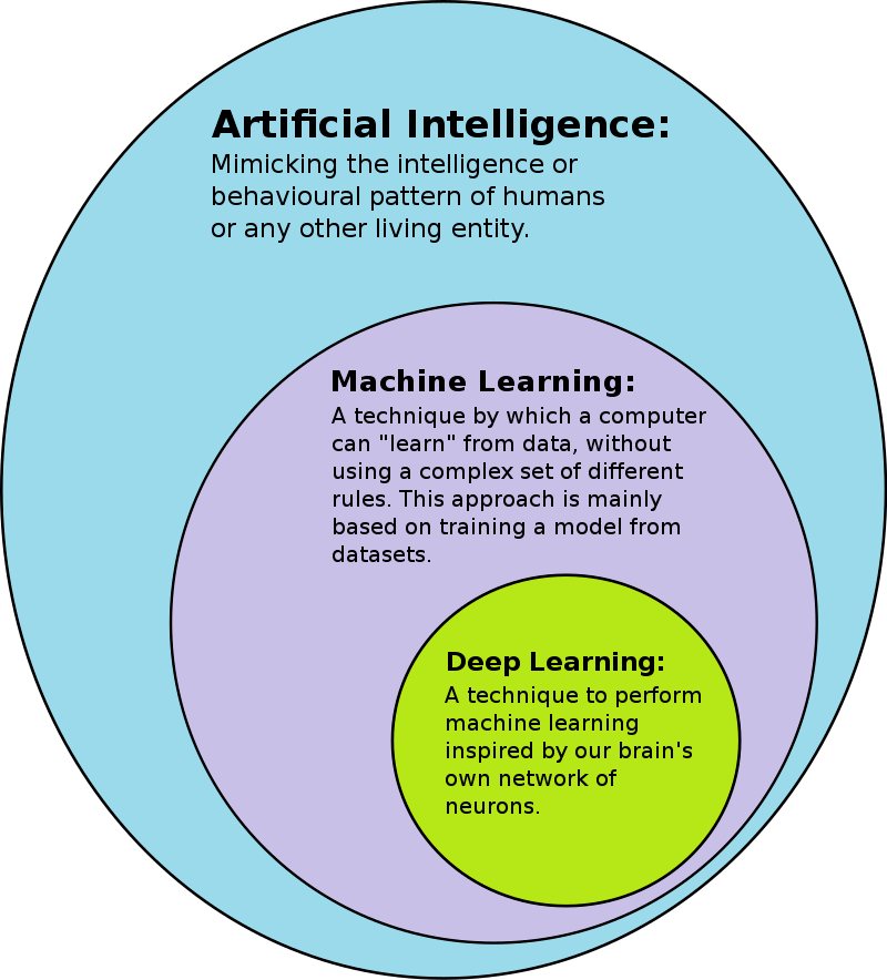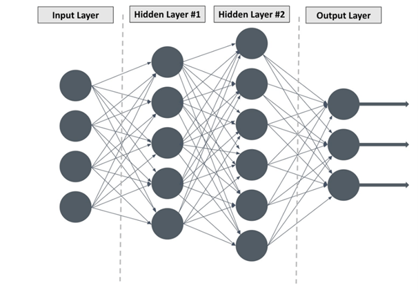 To go beyond this stage, the DeepMind group had to introduce deep learning techniques, using artificial neural networks (ANN) to enhance the learning process. As illustrated in Fig. II.3, deep learning is just an evolved subset of machine learning, which is in turn a subset of AI techniques. The design of ANN are based schematically on the vast network of neurons in the human brain, where perceptions are refined in successive stages via signals carried to different parts of the brain by sequential neuronal connections. A simple deep learning ANN is illustrated in Fig. II.4.
