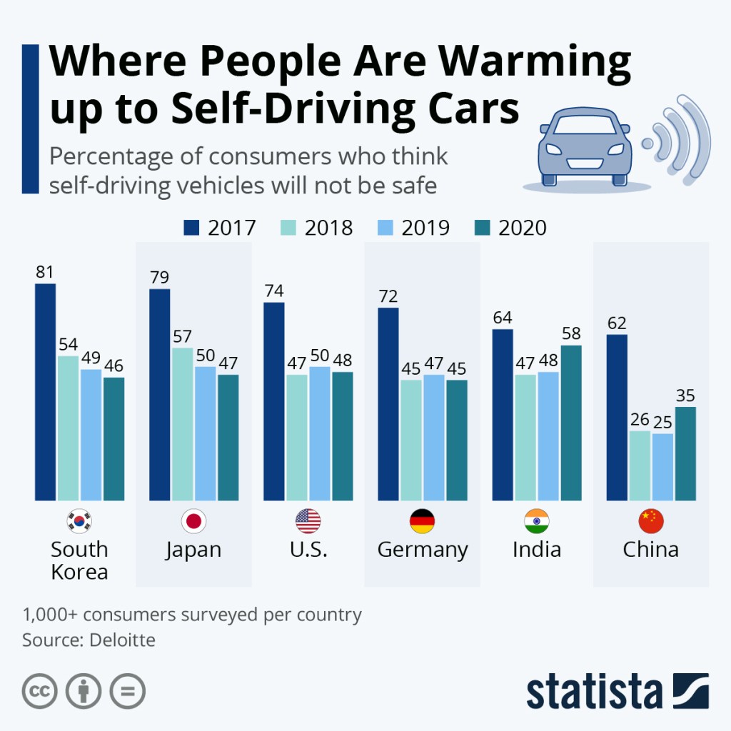 In a 2016 conversation about self-driving cars between President Barack Obama and MIT Media Lab Director Joi Ito, Ito said: “When we did the car trolley problem, we found that most people liked the idea that the driver and the passengers could be sacrificed to save many people. They also said they would never buy a self-driving car.” In fairness, consumers worldwide have grown somewhat less wary about the safety of self-driving cars since that conversation (see Fig. IV.2). But the attitude expressed by the majority in Ito’s sampling pretty much sums up where I am personally, not strictly because of the rather contrived trolley problem, but rather because AI is still a long way from being able to react like a human to unforeseen problems not previously encountered, and such problems arise with appreciable frequency when sharing roads with other drivers and living things. In addition, commercial companies have been known frequently to cut safety corners in the pursuit of bigger profits (hello, Mr. Musk), often with disastrous results. The Mercedes response also highlights another general feature of AI: it will almost always embody some biases, either conscious or subconscious, of the programmers who decide how it reacts and what data it is given to train on.