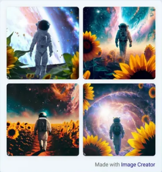 Bing AI now includes access to Bing Image Creator, which will produce an original image “simply by using your own words to describe the picture you want to see.” The image in Fig. V.3 was created by Bing in response to the query “Can you create me an image of an astronaut walking through a galaxy of sunflowers?” But this can only work if the description contains objects for which the training dataset has included labelled images.