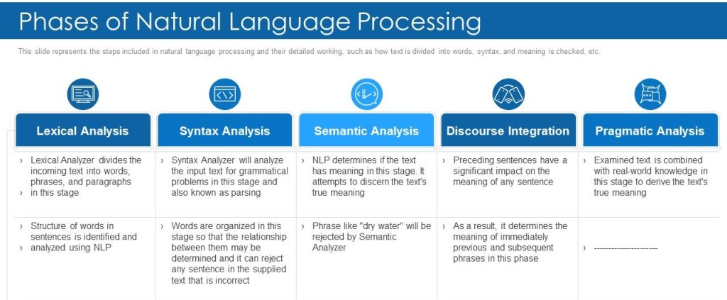 The earliest NLP applications, beginning in the 1960’s, involved specialized programs that encoded simple grammatical rules and dictionary lookup systems to allow the interpretation and construction of fairly stilted and formalized human conversation. But such systems had no way to respond effectively to the enormous complexity, variations, frequent ambiguity, sloppy grammar, and subtle indications of sentiment encompassed in normal human speech and writing. Modern applications employ statistical NLP, which combines sophisticated algorithms with deep machine learning trained on large language models to “automatically extract, classify, and label elements of text and voice data and then assign a statistical likelihood to each possible meaning of those elements.” Typical stages of NLP algorithms are shown in Fig. V.2.