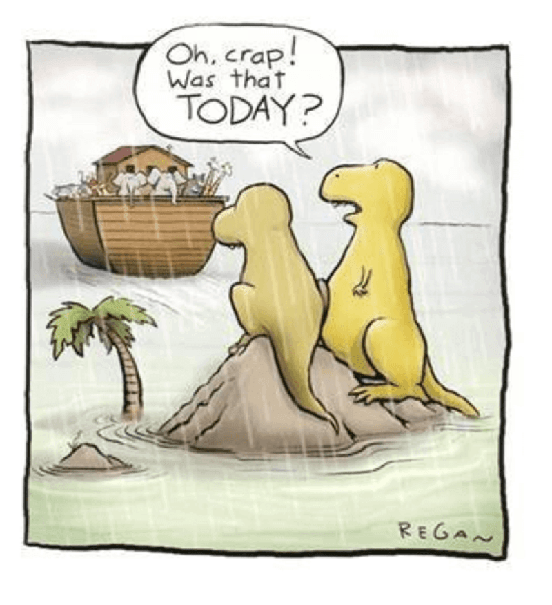 So, let’s contemplate some issues that SB202 might require to be taught in college classes, depending on who’s doing the judging of “intellectual diversity.” Would science classes have to spend as much time covering climate change denial as they do on the ample evidence for the role of humans in ongoing climate change? Heaven knows the Heartland Institute has devoted enormous effort in trying to misinform science teachers about the climate, as we have debunked here and here. Would biology courses for pre-med students have to expose students to claims that vaccines kill more people than they save, just because a few people with advanced degrees have written books claiming that is so, despite enormous evidence to the contrary? Would Intelligent Design get a second life despite all the negative court decisions? Would science courses be required to devote significant time to Bible-inspired claims that the Earth and the universe are only 6,000 years old, despite enormous amounts of cosmological, astronomical, geologic, paleontological, and even archaeological evidence to the contrary? After all, young Earth creationists disregard evidence that the dinosaurs underwent extinction 66 million years ago. Instead, they claim that the dinosaurs just weren’t fast enough to outrun the Great Flood. Or perhaps, as suggested in Fig. IV.7, they just missed the boat.