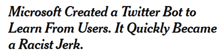 Microsoft Created a Twitter Bot to Learn From Users. It Quickly Became a Racist Jerk https://www.nytimes.com/2016/03/25/technology/microsoft-created-a-twitter-bot-to-learn-from-users-it-quickly-became-a-racist-jerk.html