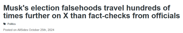 Musk’s Election Falsehoods Travel Hundreds of Times Further on X Than Fact-checks From Officials https://www.nbcnews.com/tech/misinformation/musk-election-misinformation-x-officials-twitter-voting-rcna176938