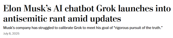 Figure III.3: Washington Post headline after the xAI Chatbot Grok came out with racist and antisemitic statements, and called itself “MechaHitler.”