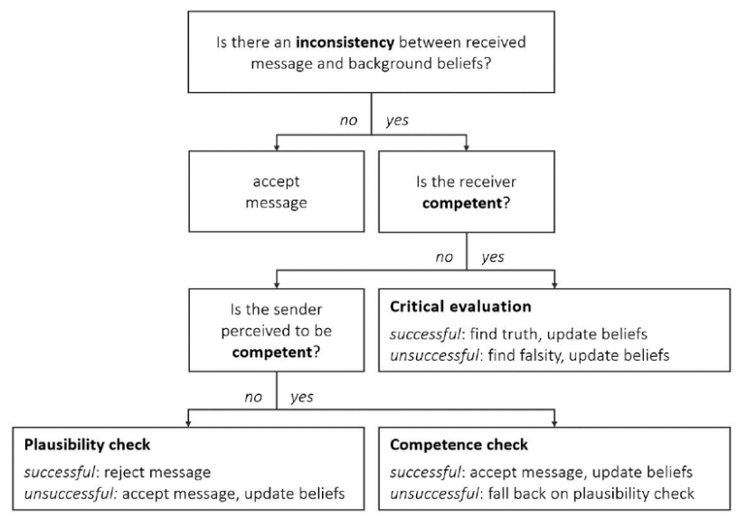 However, not all new incoming information is reliable – it may be uncertain or misinformation or disinformation — and reacting to it may be harmful to the receiving individual’s well-being. So human brains have evolved to be wary of updating the mental model too easily. This evolved resistance to mind change is known as epistemic vigilance (“epistemic” is a term from philosophy that describes phenomena related to knowledge or cognition). Figure II.3 contains a flow chart used to develop a computational model of epistemic vigilance. But the flow chart does not explicitly show an important feature of the brain’s critical evaluation processes: normally, it takes multiple examples of dissonant information to get a human brain to accommodate it.