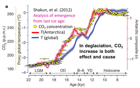 As seen in Fig. II.1, the LGM was followed by a rise in Antarctic temperatures by about 2°C over three millennia, and a similar rise in global temperatures after a delay to allow for warm southern waters and atmospheric carbon dioxide to drift northward and for the gradual receding of the northern hemisphere ice sheets. That rise was then interrupted by a significant dip in temperatures associated with an event known as the Younger Dryas (YD in Fig. II.1). That event is believed to have been caused by the fairly rapid melting of the Laurentide ice sheet that covered much of North America, leading to an influx of cold fresh water into the north Atlantic and to consequent disruptions of Atlantic Ocean currents. As shown in Fig. III.1, that dip cooled central Greenland by more than 5°C as the weakened Atlantic current slowed the circulation of warmer southern waters toward the north. It was followed, about 11,600 years ago, by an extremely rapid rise in Greenland temperatures by about 10°C over less than a single century, as Greenland ice accumulations increased and the Atlantic current was perhaps restored. The Younger Dryas should serve as a cautionary tale about the nonlinear nature of Earth’s climate and the strong sensitivity of regional climates to shifts in the thermohaline ocean currents, which are driven by differences in ocean temperature and ocean salinity in different regions of the globe.