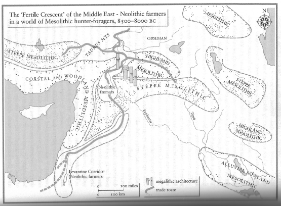 Graeber and Wengrow stress that the early adoption of farming was not at all uniform. Indeed, as indicated in the map in Fig. III.3, Neolithic farming communities were interspersed in the Fertile Crescent with Mesolithic (middle stone age) hunting and foraging groups that had ample available wild resources to satisfy their immediate needs. The stabilized climate proved a boon to foragers as well as to farmers. “The most vigorous expansion of foraging populations was in coastal environments, freshly exposed by glacial retreat. Such locations offered a bonanza of wild resources. Saltwater fish and seabirds, whales and dolphins, seals and otters, crabs, shrimp, oysters, periwinkles and more besides. Freshwater rivers and lagoons, fed by mountain glaciers, now teemed with pike and bream, attracting migratory waterfowl. Around estuaries, deltas and lake margins, annual rounds of fishing and foraging took place at increasingly close range, leading to sustained patterns of human aggregation quite unlike those of the glacial period, when long seasonal migrations of mammoth and other large game structured much of social life…Expanding woodlands offered a superabundance of nutritious and storable foods: wild nuts, berries, fruits, leaves and fungi, processed with a new suite of composite (‘micro-lithic’) tools. Where forest took over from steppe, human hunting techniques shifted from the seasonal coordination of mass kills to more opportunistic and versatile strategies, focused on smaller mammals with more limited home ranges, among them elk, deer, boar and wild cattle.”