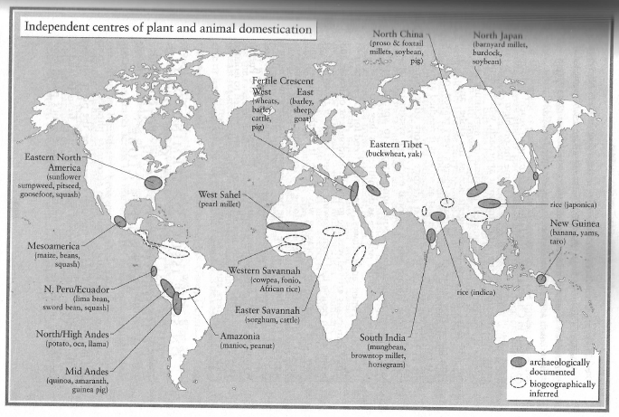 Each of the disparate sites in Fig. III.5 had its own specialty crops and domestic animals, and archaeological finds also reveal that each had its own distinctive culture. Farming communities continued, throughout most of the Neolithic period, to be interspersed with hunting and foraging communities. In some locations, like the Amazon valley in South America, inhabitants appear to have divided their time between the two, spending each rainy season in riverside villages to grow a variety of crops, which were then largely abandoned during the dry season, when the group would break up into small nomadic bands to hunt and forage.