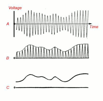 This EM wave is passed through a crystal that is coupled to a conductor; in early radio sets a crystal was connected to a fine wire. When EM waves of certain frequencies are sent through the crystal-conductor junction, the alternating carrier wave voltage is converted into a voltage only in one direction (as shown in Fig. 10.B). So the crystal and wire make up a primitive form of a diode, a circuit element that converts alternating current input to a direct current output. Then another component of the radio (called a bypass capacitor) removes the RF oscillations from the signal, leaving only the variation in pulse height, as shown in Fig. 10.C. The fluctuations in pulse height denote the signal that is converted into sound in the earphones.