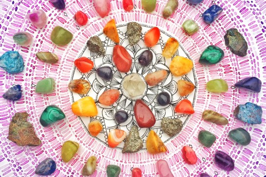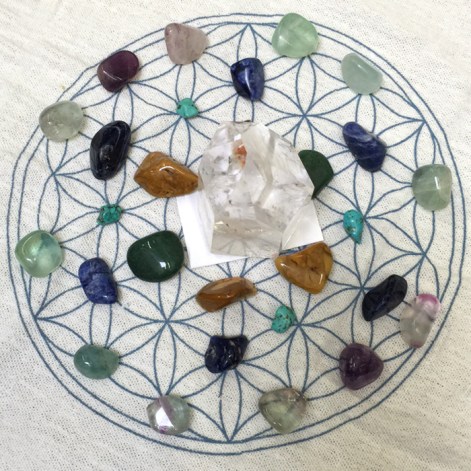 Heather Askinosie advises on how to construct a crystal grid. One first chooses a goal: bring more abundance into your life? Maintain health & fitness? Boost creativity? Sleep through the night? Next, write your intention on a piece of paper, and place the paper in the center of a crystal grid cloth. Choose crystals that “are aligned with your intention and enhance it.” Thus, for abundance one would choose green or gold ‘wealth crystals’ such as adventurine, citrine or pyrite; for health & wellness one would pick blue and purple ‘healing stones’ such as fluorite, sodalite or angelite. Arrange the crystals in a grid, working from the center outward, while keeping your intention firmly in mind. Place a pointed quartz crystal in the center of your grid, atop the piece of paper, pointing upward (that will “direct your intention straight upward into the universe”).