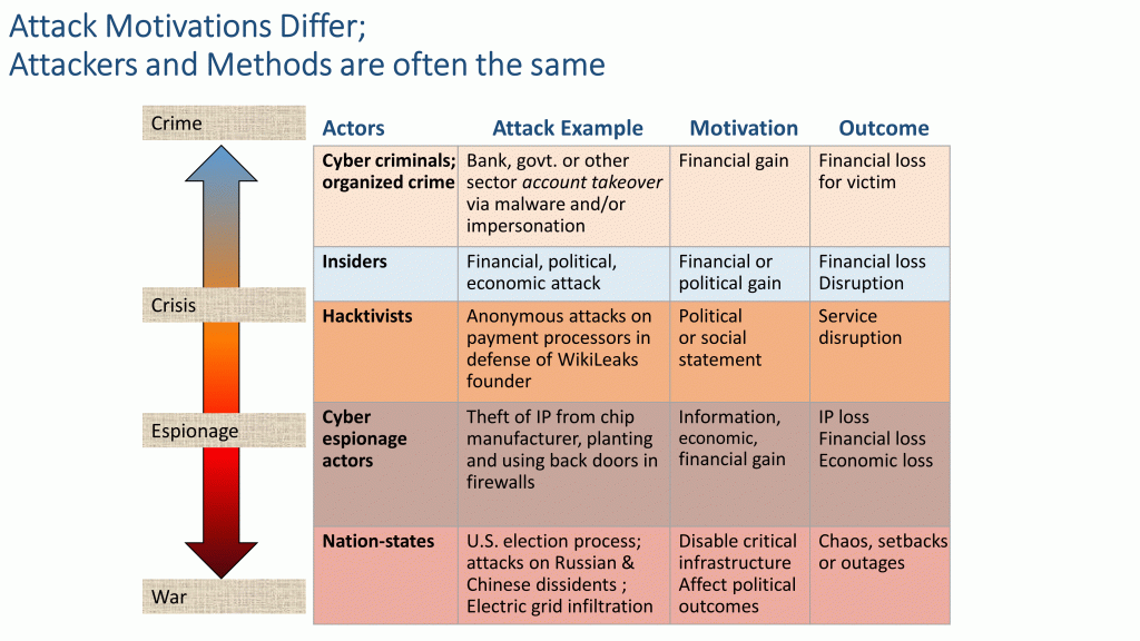 Many of the posts on this site deal with the pseudoscience and disinformation that get spread when unintended global consequences of human-developed technology collide with the bottom-line interests of corporations and governments. The current post extends that theme to information technology, namely, to the unintended consequences of our rapidly growing reliance on computers and software to store our data, protect our secrets, communicate with friends and colleagues, pay our bills, and control our accounts, our elections and our infrastructure. Exploitation of flaws in the software and hardware on which that technology rests fuel cybercrime, cyber-espionage and cyberwar.