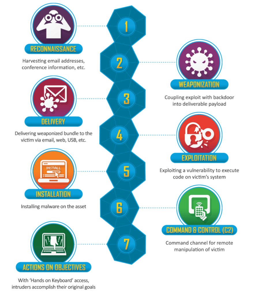 While cybercrime is a growing problem, the most dangerous cyber threats are posed by nation-states, which have the resources to find, purchase or steal extensive suites of zero-day vulnerabilities, and to assemble large teams of advanced hackers to turn those vulnerabilities into sophisticated exploits. The most sophisticated attacks often feature chains of zero-day exploits and deadly payloads a nation-state can stealthily insert into networks of adversary nations or targets of industrial espionage, or use to spy on their own citizens’ whereabouts, banking transactions and interactions with other citizens, domestic or foreign. Lockheed Martin has described the generic phases of such targeted attacks as a “cyber kill chain,” illustrated in Fig. II.5.