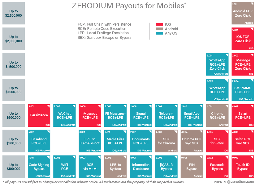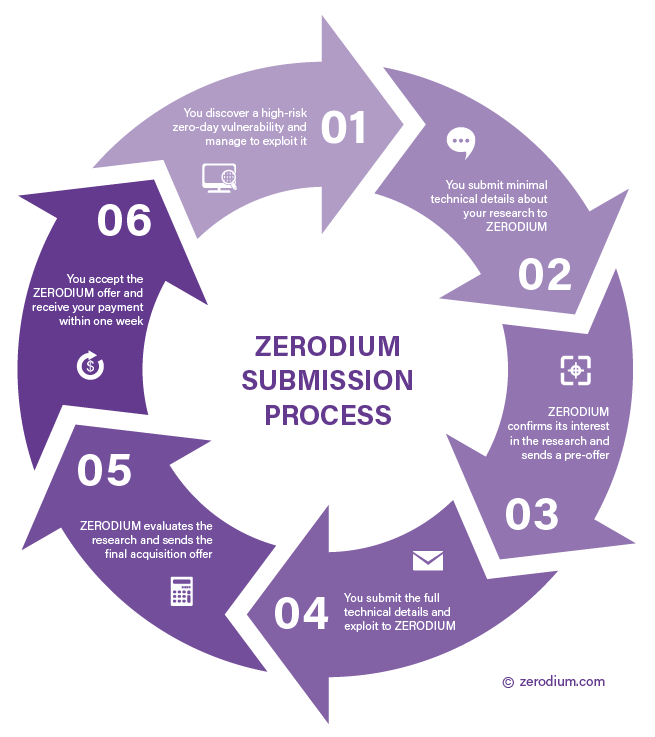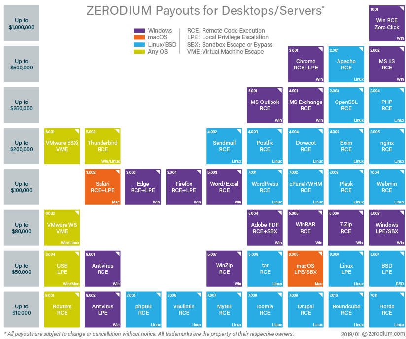“ZERODIUM is the world’s leading exploit acquisition platform for premium zero-days and advanced cybersecurity capabilities. We pay BIG bounties to security researchers to acquire their original and previously unreported zero-day research. While the majority of existing bug bounty programs accept almost any kind of vulnerabilities and PoCs but pay very low rewards, at ZERODIUM we focus on high-risk vulnerabilities with fully functional exploits and we pay the highest rewards (up to $2,500,000 per submission).”