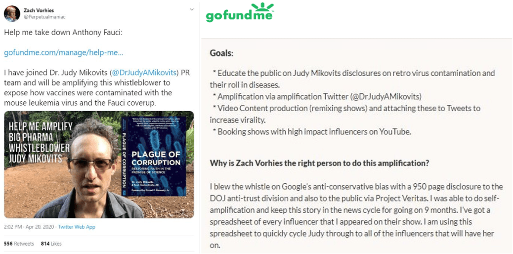 In addition to promotion of Plandemic by anti-vaccination activists, that video has also been pushed by groups that are active in spreading conspiracy theories. On April 19 Zach Vorhies, a former YouTube employee who has recently actively worked with the group QAnon, set up a GoFundMe campaign, requesting “Help me amplify Pharma Whistleblower Judy Mikovits” (Mr. Vorhies appears in Figure 12 ). QAnon is behind a series of increasingly bizarre conspiracy theories. We reviewed QAnon and its activities in our blog post on Science Denial and the Coronavirus.