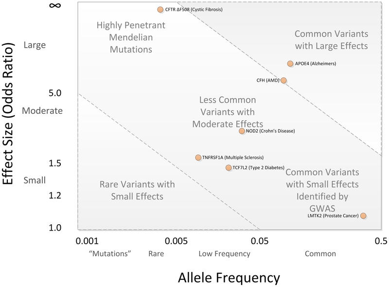 By now, several thousand disease-related GWAS have been performed, and currently they often include cohorts containing a million or more individuals, to better establish the statistical significance of allele frequency differences. Figure 5 shows for some diseases the degree of correlation between particular alleles and susceptibility to the disease (the odds ratio of getting the disease for individuals with, relative to those without, the allele of interest) on the y-axis vs. the frequency of the correlated allele in the general public, on the x-axis. So, for example, cystic fibrosis is quite rare among humans, but is caused by mutations to a specific gene. Prostate cancer is very common, and there is a weak correlation in allele frequency between prostate cancer sufferers and control groups.