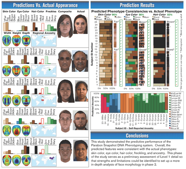 The Parabon website does now feature a poster with results shown in Fig. 7, reporting a blind study of accuracy of Snapshot reconstructions of 24 volunteers for a University of North Texas (UNT) project done in collaboration with Parabon. The subjects were recruited by UNT based on their phenotypic and ancestral diversity. 25 anonymous DNA samples were sent to Parabon, including one two-person mixture. Each sample was genotyped using an Illumina chip sorting through 851,274 SNPs, and the results were run through the Snapshot algorithm to reconstruct skin color, eye color, hair color, prevalence of freckles, width, height and depth of facial features, regional ancestry and a composite facial reconstruction for each blind sample.