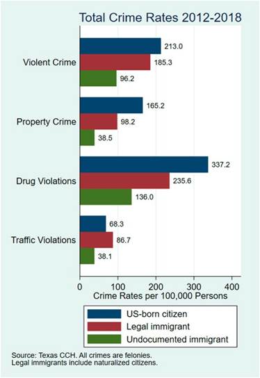 Both on the campaign trail and in the White House, Donald Trump continually plays the race card and makes explicit racist comments about immigrants, non-whites and Muslims. And he occasionally justifies it with comments that refer directly to discredited arguments from the original era of eugenics. However, in other cases, Trump does not bother to refer to any theories. He simply recites phony statistics to “prove” his assertions that immigrants are the cause of terrible problems in this country. For example, he has justified sending National Guard troops into large cities with Democratic mayors by claiming that immigrants are criminals. Figure III.6 shows U.S. crime rates in four categories. For each category, the blue bar is crimes by U.S.-born citizens; the red bar is crimes committed by legal immigrants; and the green bar is crimes committed by undocumented immigrants. The top category is violent crimes; 2nd from top is property crimes; 3rd from top is drug violations; and the bottom category is traffic violations. In every category, undocumented immigrants commit crimes at the lowest rate; and in the top 3 categories U.S.-born citizens commit crimes at the highest rate. For violent crime, U.S.-born citizens commit crimes at a rate 2.2 times higher than undocumented immigrants; for property crimes the rate is a factor 4.2 higher; and for drug violations the rate is a factor of 2.5 higher for U.S.-born citizens.