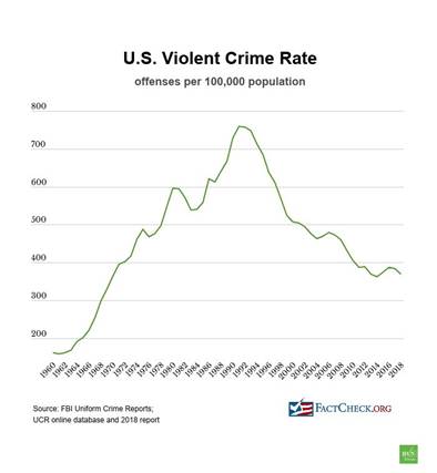 Donald Trump’s assertions about crimes committed by undocumented immigrants are completely false. He simply makes up these figures, and his supporters (including nearly all Republicans in Congress) repeat them. Another of Trump’s claims is that there is a great spike in violent crime, primarily in cities with Democratic mayors. And this justifies his sending troops and ICE into major Democratic cities. Figure III.7 shows the U.S. violent crime rate from 1960 to 2018. The crime rate peaked in 1991, and the violent crime rate in 2018 was half that at its peak.