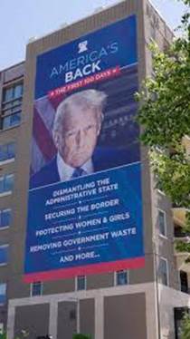 Figure III.4: A banner of Donald Trump hanging from the headquarters of the Heritage Foundation in Washington, D.C. It shows the extent to which the Heritage Foundation has aligned itself with Trump’s personality. In Dec. 2025, at least a dozen staffers resigned from the Foundation because of support by their president Kevin Roberts over Tucker Carlson’s embrace of white supremacist and anti-Semite Nick Fuentes.