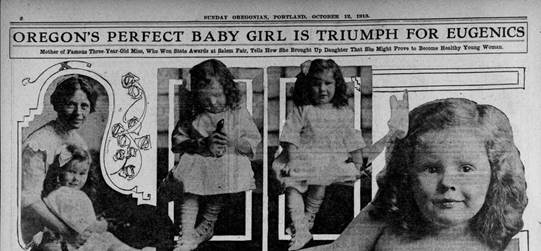 President Theodore Roosevelt was an advocate of eugenics. He stated “Any group of farmers who permitted their best stock not to breed, and let all the increase come from their worst stock, would be treated as inmates for an asylum.” The eugenics movement advocated for both “positive” efforts to inform citizens of best health practices, and “negative” efforts that tried to prevent “unfit” individuals from reproducing. An example of positive eugenics was the wellness movement. This emphasized healthy living through good nutrition and exercise. One of the most successful ventures in healthy living was the Battle Creek Sanitarium run by the Kellogg brothers in Michigan. In a number of states, women’s groups sponsored exhibits at state fairs. These dispensed information on healthy nutrition and childbirth and child-raising information. They also held competitions to determine the “most eugenic babies.” The criteria were based on submission of family histories, and inspection of the contestants in methods similar to “hog judging” events. Figure II.1 shows the winner of a “perfect baby girl” competition at the Oregon State Fair. As far as we can tell, it never occurred to the organizers of these events that there was any discrimination involved when all winners turned out to be blond-haired, blue-eyed youngsters. But certainly information on the latest developments in nutrition and wellness were helpful to citizens of these states.