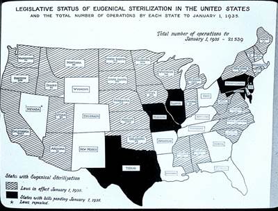Various American groups mobilized to sterilize “unfit” members of society. The way was cleared for states to pass laws requiring compulsory sterilization with the 1927 U.S. Supreme Court ruling in the case Buck v. Bell. In that case the court ruled that the state of Virginia could sterilize “feeble-minded” citizens (in most cases females) without their consent. Figure II.5 shows the status of compulsory sterilization laws in the U.S. as of Jan. 1, 1935. At that time, 29 states had sterilization laws on the books (our state Indiana was the first to pass such a law), while 7 states had sterilization laws pending and only 12 states had no compulsory sterilization laws. After 1935, a number of states revoked these laws. However, a number of these sterilization laws remained on the books for an uncomfortably long time. The last state to revoke its compulsory sterilization law was Oregon in 1983.