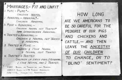 But the state fair booths also included information claiming that the “fitness” of Americans was declining at an alarming rate. Figure II.2 shows a poster that was displayed at eugenics workshops and also at some state fairs. The poster first warns that American society is decaying, because we leave reproduction up to “chance,” while we take care to selectively breed animals to insure that the “best” qualities are passed on. The poster also claims that the only reproduction that produces good results is between “pure” men and “pure” women. All other couplings are said to produce “abnormal” or “tainted” offspring.