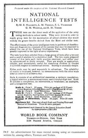 Attempts to measure intelligence began with French psychologist Alfred Binet. He and a colleague produced a test that was designed to determine whether young children should be placed in regular classrooms, or whether they should receive special education. Binet’s test was turned by American psychologists into an intelligence quotient or “IQ” exam. But while Binet was careful to ensure that his exam was only used for positive outcomes, the American IQ exams were used by eugenicists for much more negative purposes. An advertisement for a “National Intelligence Test” which later became the “Stanford-Binet” IQ exam is shown in Figure II.6. First, despite the claim of the IQ testers that the exams measured innate intelligence, the early exams contained much material that had nothing to do with basic intelligence but instead asked questions that could be answered by middle-class Americans. Here is one such question. Crisco is a: i) patent medicine; ii) disinfectant; iii) toothpaste; iv) food product. People taking the test were assigned a “mental age;” for example, if a person achieved the same grade on the exam as the average 15-year-old, their mental age was 15. A comprehensive critique of early IQ tests was made by Stephen Jay Gould in his 1981 book The Mismeasure of Man.