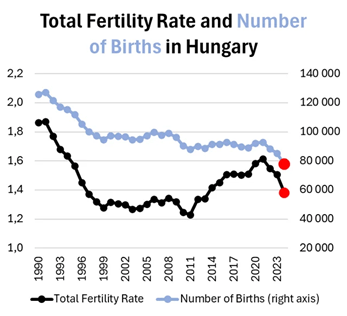 Figure V.3: The fertility rate in Hungary (left axis) and the number of births (right axis) as a function of time. In 2011, Hungary adopted several programs designed to increase the fertility rate. It increased significantly until the pandemic, when it decreased again. The current fertility rate, 1.38, is slightly below the European average.