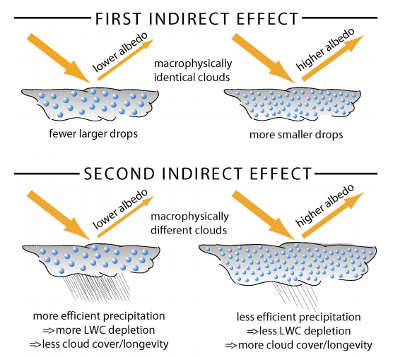 Part of the complication is indicated in Fig. IV.3, which shows that thick, low-lying clouds tend to reflect some solar radiation back out into space, producing a cooling effect, but also some infrared radiation back to Earth’s surface, producing a warming effect. Models tend to show that the cooling effect dominates over the heating, but the error bars on that conclusion are rather large and the difference clearly depends on the size of the droplets formed inside the clouds. In addition, modifying clouds can cause complex changes to weather and precipitation patterns at Earth’s surface, leading again to a wide variety of potential unintended consequences. A reduction in sea surface temperatures might change ocean circulation patterns, and therefore also weather over land, and adversely affect marine ecosystems; increased cloud cover could negatively affect photosynthesis, plant growth and agriculture. A research coalition called the Marine Cloud Brightening Project, formed in 2009 and now headquartered at the University of Washington, encompasses modeling, field experiments, technology development and policy research to study cloud-aerosol effects and MCB.