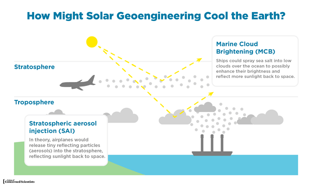 The methods considered to increase albedo involve making Earth land masses or low-lying marine clouds brighter, or injecting aerosols into the stratosphere, or installing enormous mirrors out in space. The suggested atmospheric engineering approach to increase infrared transmission involves thinning out high-altitude cirrus clouds that absorb in the infrared. Considerations of the science, the technical challenges, and the potential cost-effectiveness of these proposals has constrained current focus to two of the five: stratospheric aerosol injection (SAI) and marine cloud brightening (MCB). We will discuss these two approaches, respectively, in some detail in Sections III and IV below, and then we will briefly summarize the problems faced by the other approaches in Section V. A thorough review of the technical aspects of SAI and MCB approaches was carried out by the U.S. National Academies of Sciences in 2015.