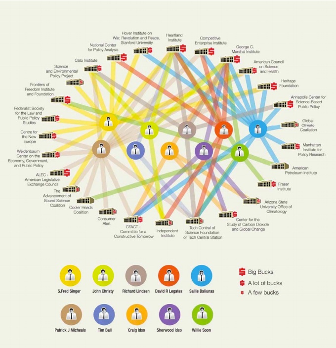 The appearance of many think tanks, all opposing what they term the “junk science” or overemphasizing the “uncertainties” behind diverse regulatory proposals, thus hides the fact that it is actually a very small group of politically motivated, or possibly just contrarian, scientists who generate all of this noise and considerable political pressure. This point has been made compellingly in Merchants of Doubt by Naomi Oreskes and Erik Conway. In the case of climate science denial, this diffusion of funding through a large number of astroturf organizations, all contributing to and benefiting from the work of a small cadre of helpful scientists – a tiny group in comparison to the number of serious worldwide climate scientists – is illustrated in Fig. II.2, using data exposed by Greenpeace. The astroturfing serves both to obscure the centrality of industry funding and to manufacture a fake “groundswell.” The “research” that underpinned the claims of strong uncertainties in climate science relied on standard elements of the science denier’s toolbox: cherry-picked and misrepresented data, reliance on carefully selected anomalous outlier results, apples-to-oranges comparisons of models to measurements, impugning the motives of the majority of climate researchers projecting serious consequences of global warming, etc.