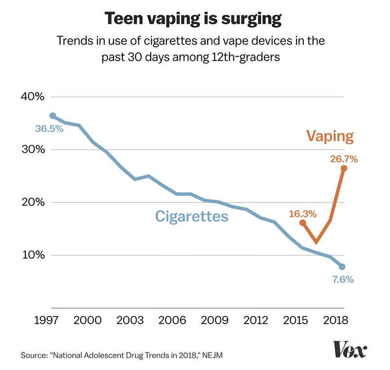 The MSA did succeed in leading to a substantial decrease in use of tobacco products, especially among high school students. Unfortunately, that decrease has now been counterbalanced by rapid growth among teens in the use of e-cigarettes (see Fig. III.2), which still contain nicotine. State attorneys general are now pursuing a new MSA with the e-cigarette manufacturer Juul.