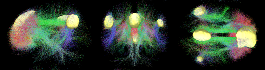 In order to understand how psychedelics affect connections within the brain, one should start with some understanding of connections in an unaffected brain. Brain activities tend to involve networks of several brain regions connected by subsets of the full neuron connectome. Imaging studies on normal human brains have revealed the existence of a Default Mode Network (DMN) comprising the brain regions and neural connections among them that are continuously active as a baseline “rest” mode, even when an individual is not focused on any particular mental task or interaction with the outside world. The DMN was discovered in studies by Marcus Raichle and collaborators at the Washington University School of Medicine, who also showed that the brain’s energy consumption is increased by less than 5% of its baseline default mode energy consumption when it focused on a specific mental task. The regions of the brain involved in the DMN are illustrated in the fMRI scan shown in Fig. IV.7: the medial prefrontal cortex, the posterior cingulate cortex, and the angular gyrus, with the posterior cingulate cortex acting like a transit hub hosting a large number of neural connections, as revealed in the DMN connectome shown in Fig. IV.8.