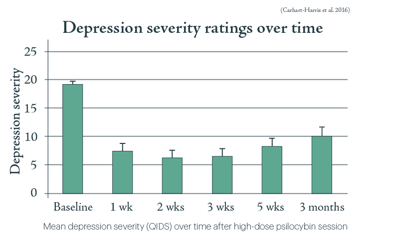 Psilocybin usage for treatment-resistant depression (TRD) has been pioneered by the Beckley Foundation/Imperial College research program led by Amanda Feilding and David Nutt. Psilocybin has by now been delivered orally to 20 patients who had been suffering from moderate to severe depression for an average of 18 years, each of whom had previously tried at least two other treatment methods without success. Each patient received two doses of psilocybin, first 10 then 25 mg, 7 days apart, accompanied by psychological support before, during and after each session. Symptoms were then periodically tested via the Quick Inventory of Depressive Symptomatology (QIDS). All showed some improvement, with maximal reduction in symptoms within 5 weeks after the larger dose (see Fig. V.3). The magnitude of the improvement was strongly correlated with the subject-reported quality of the acute psychedelic experience. Some improvement persisted even 3 months after treatment. The drug was well tolerated by all participants, and none sought conventional antidepressant treatment within 5 weeks of the second psilocybin dose.