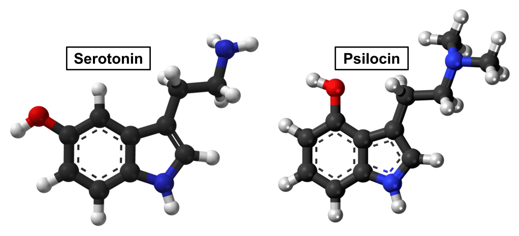 The chemical structure of serotonin is compared in Fig. IV.6 to that of psilocin, the chemical formed from the psilocybin in magic mushrooms when it undergoes hydrolysis inside the body’s gastrointestinal tract. The striking similarity between the two chemicals is at the heart of the effect of psychedelics on the brain. When serotonin (known chemically as 5-hydroxytryptamine, or 5-HT for short) is emitted by a sending neuron, it is received across synaptic gaps by specialized receptors distributed throughout the brain. The particular receptors distributed densely throughout the cerebral cortex are labeled as 5-HT2A. Those same receptors can be activated by psilocin, so that a psilocybin or LSD (with somewhat similar chemical structure) “trip” affects the brain in a similar way as a dramatic change in serotonin signaling in the cerebral cortex.