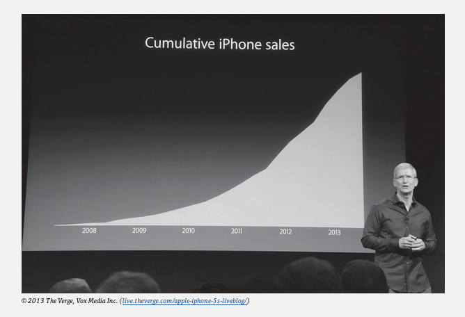 If percentages or ratios are quoted, make sure you know what the denominator (or comparison group) corresponds to.What is the size of uncertainties in the quoted values? Distinguish between plots of differential quantities, such as COVID deaths per day, vs. cumulative quantities, such as total COVID deaths to date. An increase or decrease in a differential value shows up only as a change in slope on a plot of the corresponding cumulative quantity, and can be harder to detect. So cumulative graphs can sometimes be used to hide bad news without lying. See the example in Fig. 4.1, where Apple CEO Tim Cook’s graph of cumulative iPhone sales presented to shareholders hid disappointing early 2013 sales as a small change in the slope of a persistently upward trend.