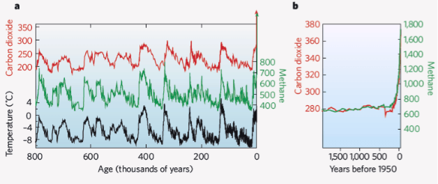 Fig. II.2 shows data gleaned from Antarctic ice core samples, that demonstrate Earth’s climate cycles over the past 800,000 years. CO2 levels are shown by the red curve and scale; methane levels the green curve and scale; and Earth temperatures are represented by the black curve and scale at left. Note the very strong correlation of Earth temperatures with the concentrations of these greenhouse gases. Note also the exceptionally rapid rise in CO2 and methane in the past 100 years, which is also apparent in the graph at right that shows the prevalence of these two greenhouse gases in the last 2,000 years. [Note: CO2 levels are in parts per million while methane levels are in parts per billion].