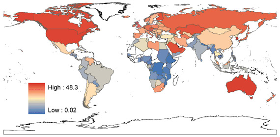 Next we show contributions from various countries to CO2 emissions. In Fig II.12 below, the countries in red (blue) represent those that emit the largest (smallest) amounts of carbon dioxide. It is clear that the developed countries of North America, western Europe, Russia and Australia are large emitters of CO2. Fig II.13 then shows those countries that are most vulnerable to the effects of global climate change. This is the so-called Climate Demography Vulnerability Index or CDVI. It combines estimates of the effects of climate change with the expected growth in population of each region. In Fig. II.13, red corresponds to more vulnerable areas while blue denotes less vulnerable regions and white refers to areas of very low population density.